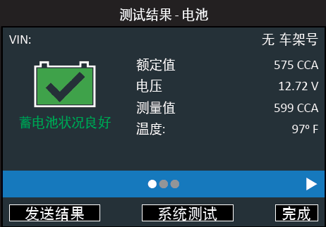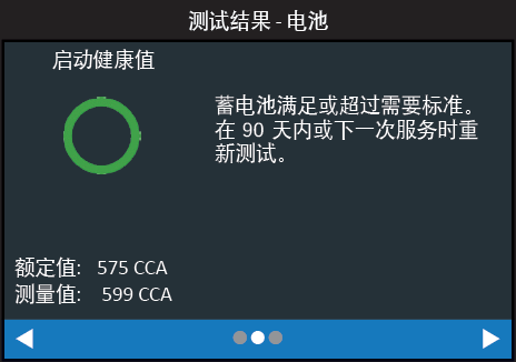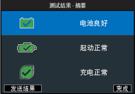 系统测试后,显示“测试结果 – 摘要”屏幕。选择“蓄电池测试”、“启动测试”或“充电测试”可查看各个测试部分的测试结果。